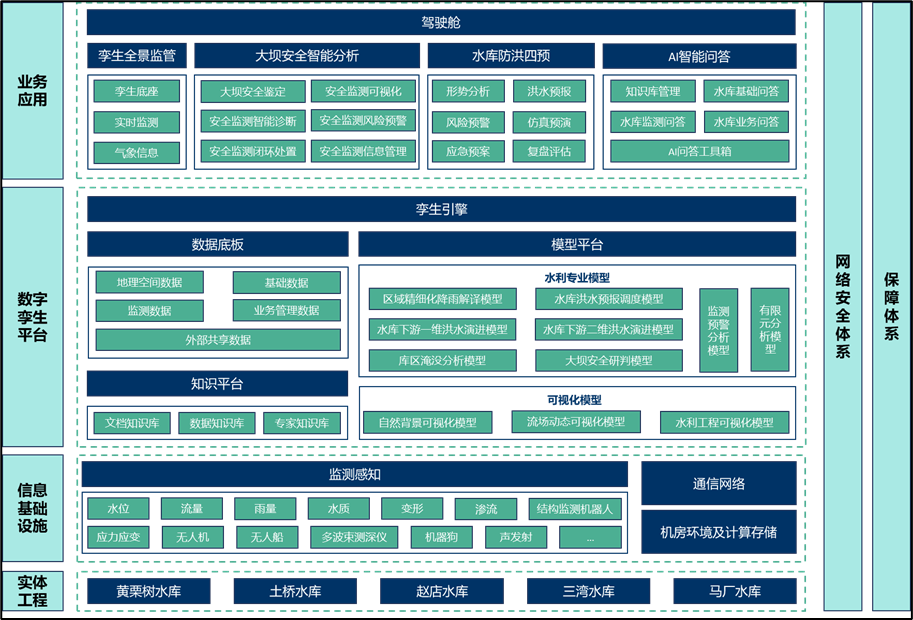《方案》以黃栗樹(shù)等五座水庫(kù)為核心對(duì)象,進(jìn)行了前瞻性的信息化總體設(shè)計(jì)。旨在通過(guò)引入先進(jìn)信息技術(shù),構(gòu)建覆蓋水庫(kù)運(yùn)行管理全生命周期的智能化體系。該體系以實(shí)現(xiàn)對(duì)水雨情、工情、供用水、水質(zhì)及安全狀況等關(guān)鍵要素的精準(zhǔn)感知、動(dòng)態(tài)監(jiān)測(cè)、智能分析與高效決策為核心目標(biāo),全面提升水庫(kù)在科學(xué)調(diào)度、風(fēng)險(xiǎn)防控、管理效能與服務(wù)保障方面的綜合能力。主要建設(shè)內(nèi)容涵蓋智慧業(yè)務(wù)應(yīng)用、數(shù)字孿生平臺(tái)、信息基礎(chǔ)設(shè)施及網(wǎng)絡(luò)安全體系,共同構(gòu)成層次清晰、協(xié)同聯(lián)動(dòng)、安全可靠的現(xiàn)代化水利信息化總體框架,為區(qū)域水安全與可持續(xù)發(fā)展奠定堅(jiān)實(shí)的數(shù)字基石。