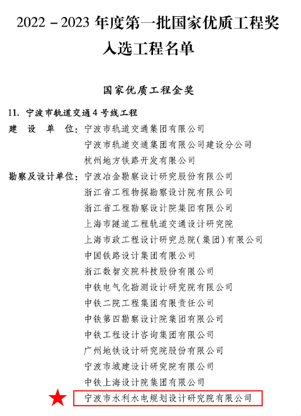 喜訊!我院參與設計的寧波軌道交通4號線(xiàn)工程榮獲國家優(yōu)質(zhì)工程金獎