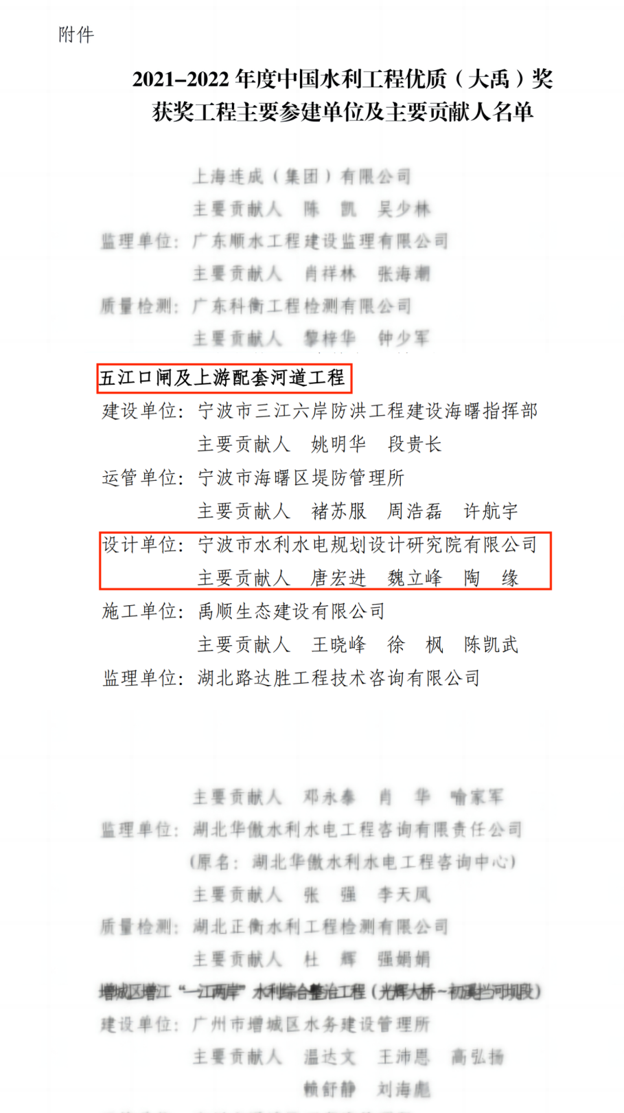 近日,2021年~2022年度中國水利工程優(yōu)質(zhì)(大禹)獎獲獎名單出爐,36個(gè)獲獎工程中,我院成功鎖定一席!此次我院設計的五江口閘及上游配套河道工程,是我院第七個(gè)榮獲大禹獎的項目。