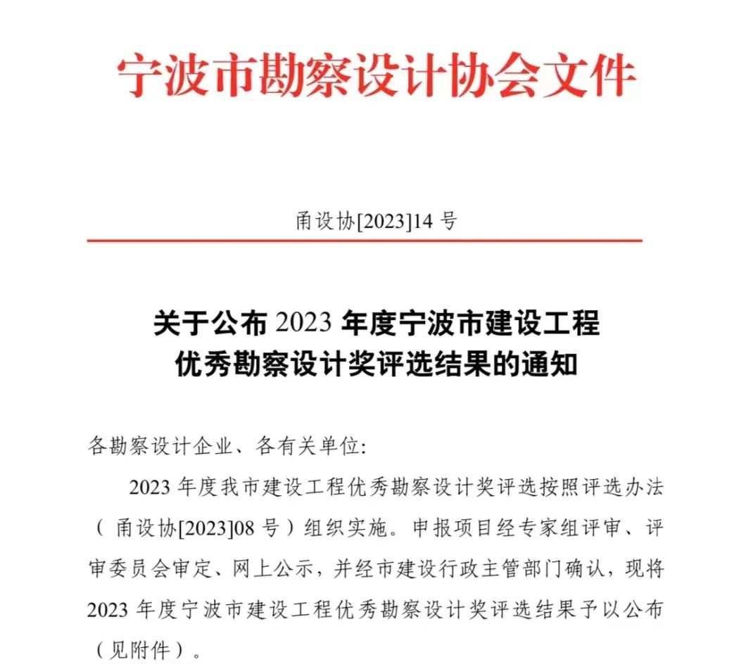 喜報 | 我院兩大項目榮獲2023年度寧波市優(yōu)秀勘察設計獎!