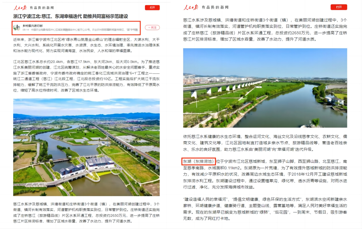 助力“幸福河湖”:人民日報客戶(hù)端報道我院慈城新城東排澇池水利工程