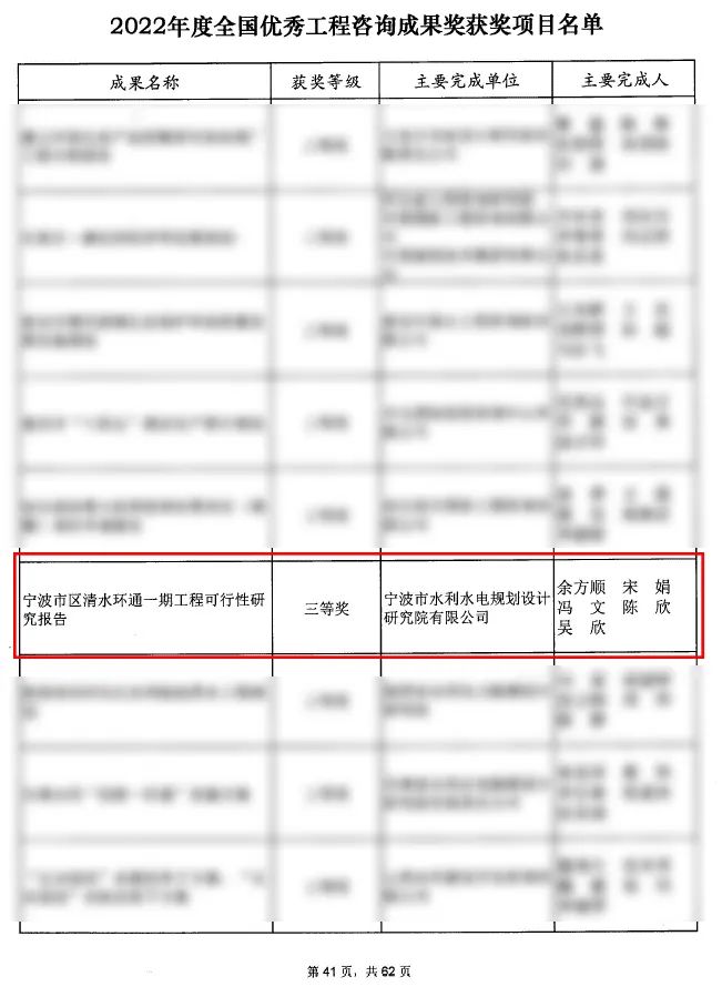 近日,中國工程咨詢(xún)協(xié)會(huì )公布2022年度全國優(yōu)秀工程咨詢(xún)成果獎獲獎項目名單,寧波市水利院申報的《寧波市區清水環(huán)通一期工程可行性研究報告》咨詢(xún)成果順利通過(guò)公示,榮獲2022年度全國優(yōu)秀工程咨詢(xún)成果三等獎!該獎項由中國咨詢(xún)工程協(xié)會(huì )組織申報評審,每?jì)赡暝u選一次,是中國工程咨詢(xún)行業(yè)含金量最高的獎項。
