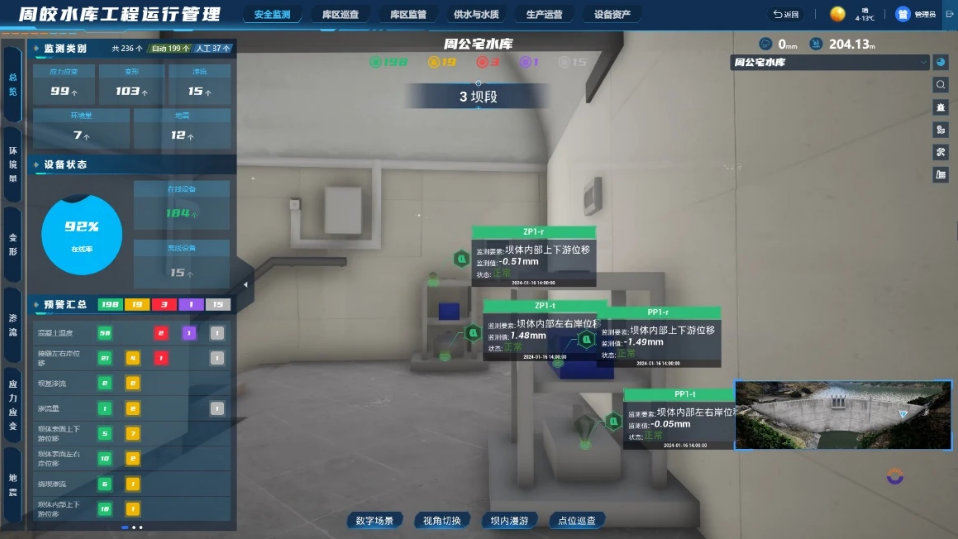 水庫大壩是流域防洪工程體系重要組成部分,是保障水安全的“重器”。數字孿生周公宅-皎口梯級水庫系統利用高精度模擬仿真引擎1:1構建水庫大壩可視化模型和工程安全監測分析模型,全面監控、深入分析水庫環(huán)境量、變形、滲流、應力應變、地震等安全要素,逐時(shí)分析大壩的各項安全指標,直觀(guān)展示大壩的安全狀態(tài)。
