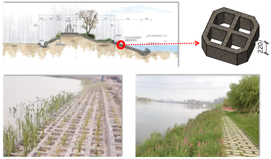 為了保證水體交換同時(shí)防御土體掏刷,工程迎水側護坡采用多孔混凝土生態(tài)護坡磚,不僅防沖固土,也利于水生動(dòng)植物生長(cháng),營(yíng)造自然、生態(tài)的水岸環(huán)境。