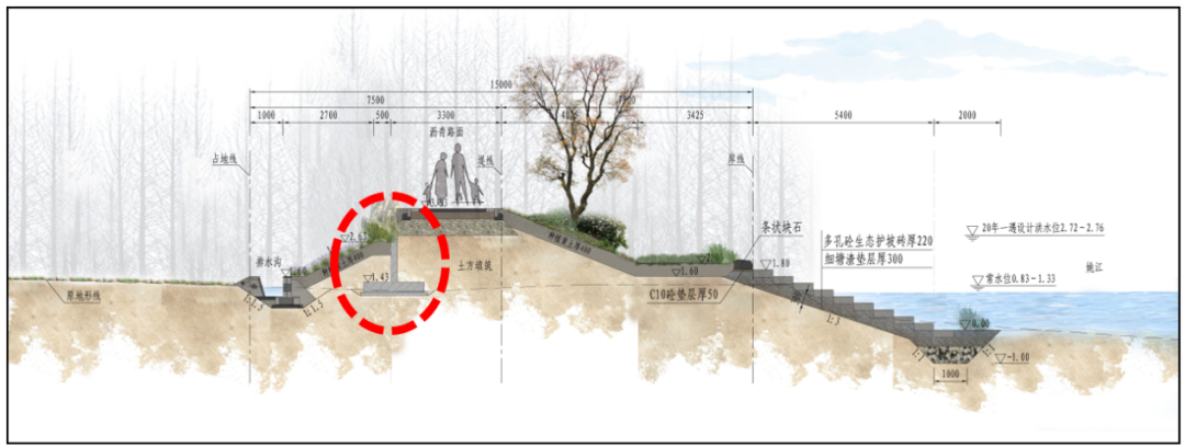 創(chuàng )新性提出超標準溢流段布設,工程沿線(xiàn)允許超標準洪水滿(mǎn)溢主動(dòng)滯洪,減少主城區的防洪壓力,確保整個(gè)防洪系統的協(xié)調性和有效性。