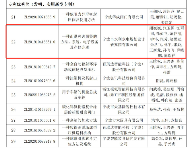 近日,寧波市市場(chǎng)監督管理局公布了第三屆寧波市專(zhuān)利創(chuàng )新大賽獲獎項目名單,我院提交參賽的發(fā)明專(zhuān)利“一種山洪災害預警的方法、系統、電子設備及存儲介質(zhì)”榜上有名,獲得本次大賽的“專(zhuān)利優(yōu)秀獎(發(fā)明、實(shí)用新型專(zhuān)利)”。
